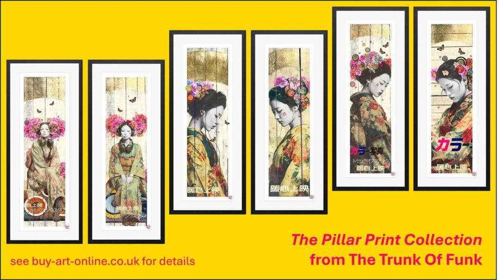 Introducing The Pillar Print Collection, a beautiful new collection from The Trunk of Funk that channels his signature fusion of traditional and modern into elegant, innovative pillar forms. Drawing on classic Japanese motifs, ideals, and composition, the collection reimagines them through a contemporary lens – a cinematic language where timeless beauty meets modern life, a seamless continuation of his iconic Urban Geisha style. This latest collection comprises six individual artworks designed to stand alone or be curated together as diptychs or triptychs. Versatile, expressive, dramatic and deeply considered, these works invite collectors to build their own narrative while celebrating the harmony between the old world and the new. See the Art of The Trunk Of Funk