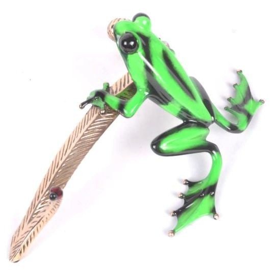 Leaning against a polished bronze reed, accompanied by the iconic Tim Cotterill ladybug, Dexter is a stunning addition to this series. The vivid lime green patina, randomly patterned with saturated black-toned markings, masterfully depicts the coloration of the Green and Black Poison Dart Frog.